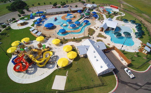 The Rock N' River Waterpark in Round Rock, Texas includes five bodies of water. The park features a large play structure complete with tot slides and water sprayers, a zero-depth entry pool with multiple water features and a lazy river, a kiddie pool with an overhead canopy, and two additional leisure pools, one with a zero-depth entry and the other with a water slide.